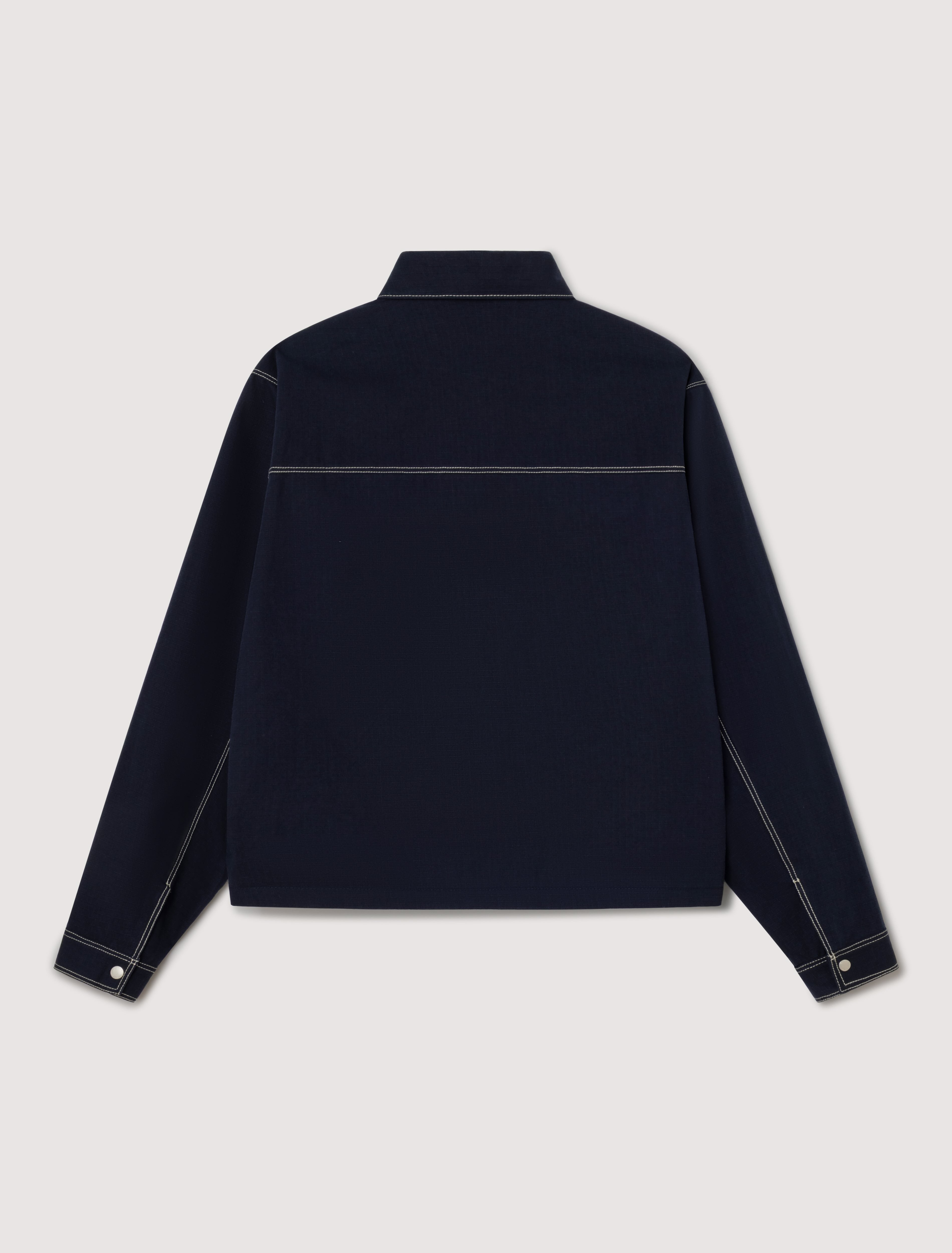 A minimal jacket with a straight, clean silhouette. Defined by contrast stitching, it sharpens the outline of the piece while keeping a refined and understated shape.